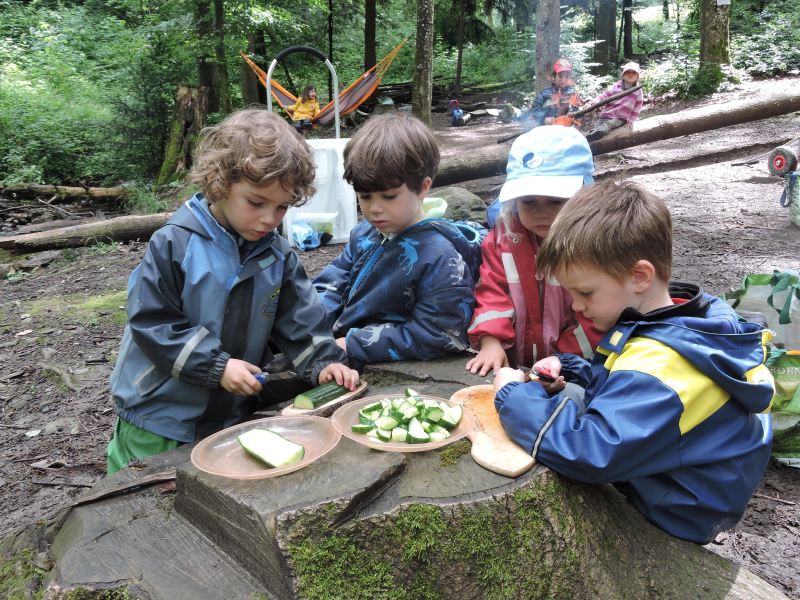 Der Wald bietet den Kindern unendlich viele Möglichkeiten für phantasievolle, kreative Betätigungen. Dabei üben sie die Kommunikation mit den anderen Kindern, sie können mit Naturmaterialien, Seilen und Sägen ihre Ideen verwirklichen und jedes kann in seinem Tempo durch neue Erfahrungen lernen.